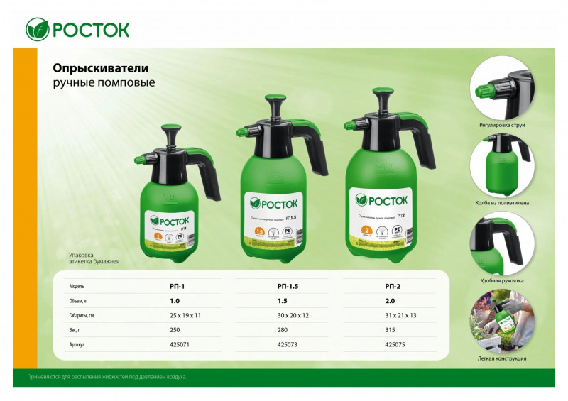 Ручной помповый опрыскиватель РОСТОК РП-1.5 1.5 л 425073 предназначен для дезинфекционных работ и ухода за растениями в овощеводстве, садоводстве, цветоводстве.